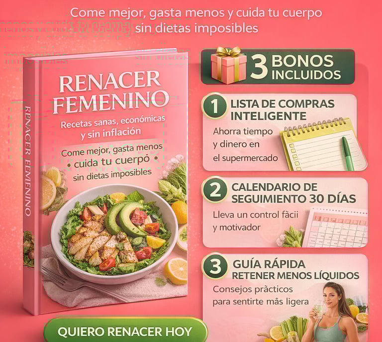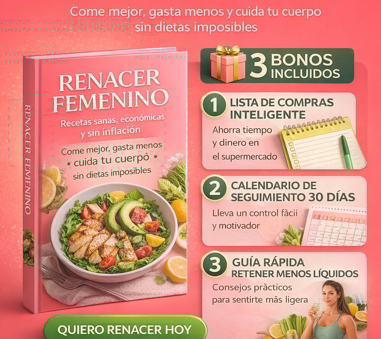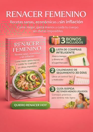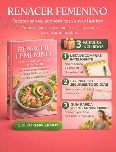 RENACER FEMENINO te ayuda a comer mejor, reducir la inflamación y recuperar tu energía cada día con recetas simples y reales para la pre y posmenopausia.