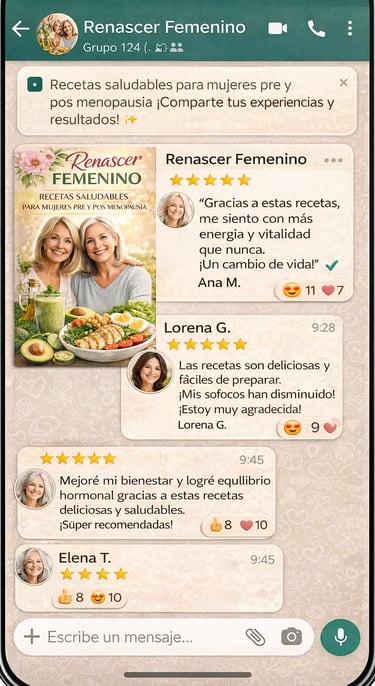 RENACER FEMENINO es una guía práctica de recetas saludables para mujeres en la pre y posmenopausia, creada para ayudarte